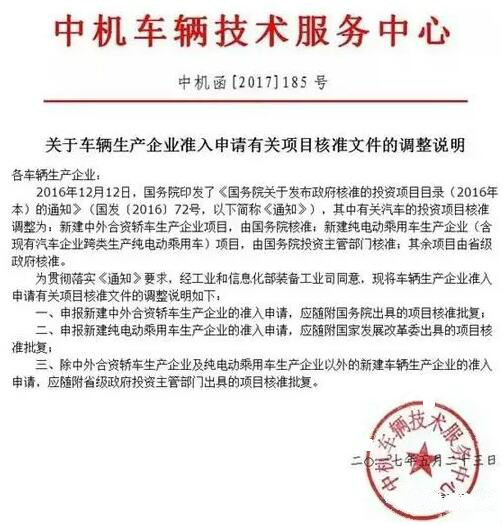 中機(jī)中心發(fā)布《關(guān)于車輛生產(chǎn)企業(yè)準(zhǔn)入申請有關(guān)項(xiàng)目核準(zhǔn)文件的調(diào)整說明》,為貫徹落實(shí)《國務(wù)院關(guān)于發(fā)布政府核準(zhǔn)的投資項(xiàng)目目錄(2016年本)的通知》的要求,將車輛生產(chǎn)企業(yè)準(zhǔn)入申請有關(guān)項(xiàng)目核準(zhǔn)文件作了調(diào)整說明。其中,除中外合資轎車生產(chǎn)企業(yè)及純電動乘用車生產(chǎn)企業(yè)以外的新建車輛生產(chǎn)企業(yè)的準(zhǔn)入申請(這里面包括新建商用車、專用車生產(chǎn)準(zhǔn)入申請)由省級政府核準(zhǔn),應(yīng)隨附省級政府投資主管部門出具的項(xiàng)目核準(zhǔn)批復(fù)。