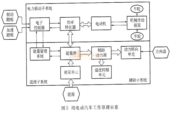 純電動汽車是由蓄電池的能量使得電動機驅(qū)動車輪前進(jìn),其工作原理示意如圖5所示。能量流動路線:蓄電池→電力調(diào)節(jié)器→電動機→動力傳動系統(tǒng)→驅(qū)動輪。其中,蓄電池提供電流,經(jīng)過電力調(diào)節(jié)器后輸出至電動機,然后由電動機提供扭矩,經(jīng)傳動裝置后驅(qū)動車輪實現(xiàn)車輛的行駛。