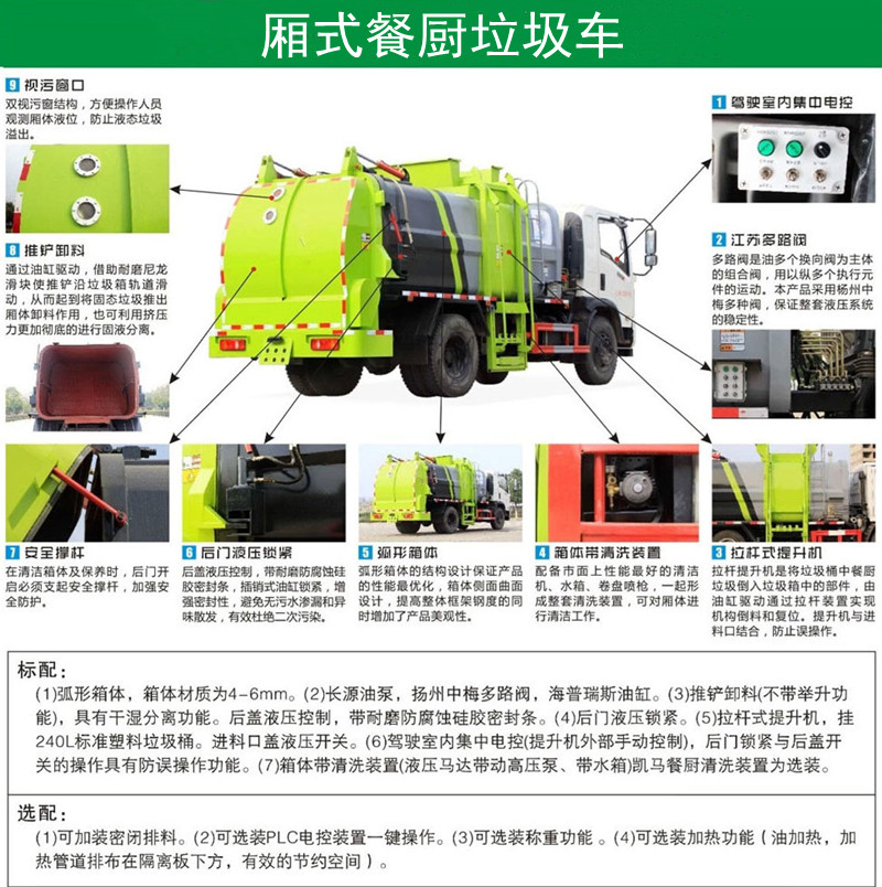 方罐式餐廚垃圾車:弧形廂體,箱體內(nèi)可實現(xiàn)固液分離,推鏟卸料,后蓋液壓開啟/鎖緊(帶耐磨橡膠密封條密封-后門關閉后滴水不漏),后門液壓鎖緊防誤操作功能,掛桶式提升機,可配合120升、240升標準垃圾桶使用,清洗裝置(帶水箱、液壓馬達帶動高壓泵)。